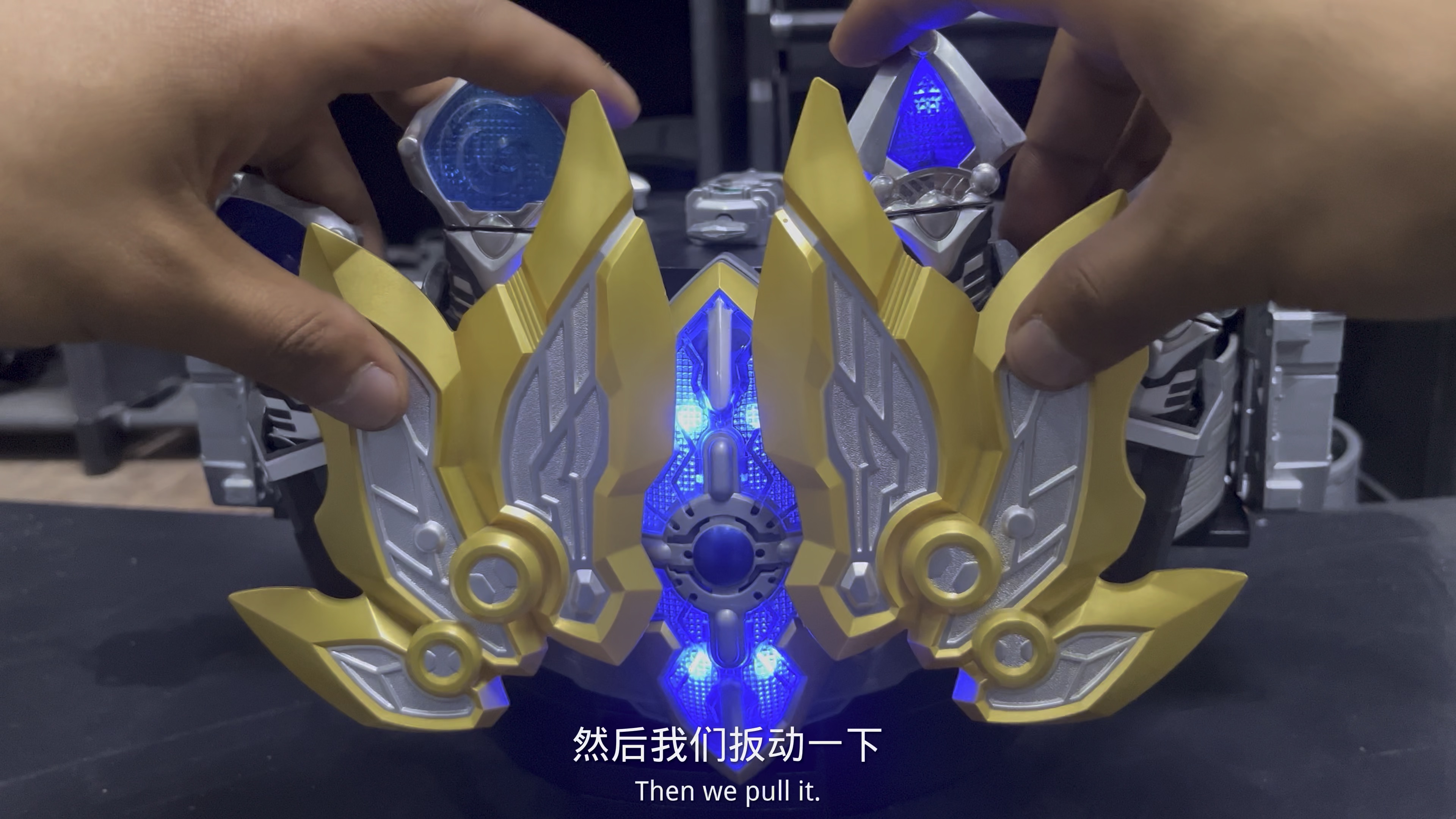 召唤人将“雷霆之石”幻化出的“雷霆雅塔莱斯召唤器”而召唤出的终极铠甲ARMOR HERO终极纪念卡·铜#雅塔莱斯此造型展现。