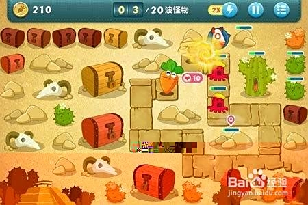 3、保卫萝卜电脑版挑战第34关金萝卜攻略如下一开局策略 炮塔选择开局时,在下图所示位置放置两个毒针炮塔,其中左边的毒针升至2级毒针炮塔可以有效减缓敌人的速度,为其他炮塔提供输出时间宝箱清理利用毒针炮塔的攻击,优先清理右边的宝箱宝箱清理后,会随机获得炮塔,其中火箭炮塔是较为理想的输出。