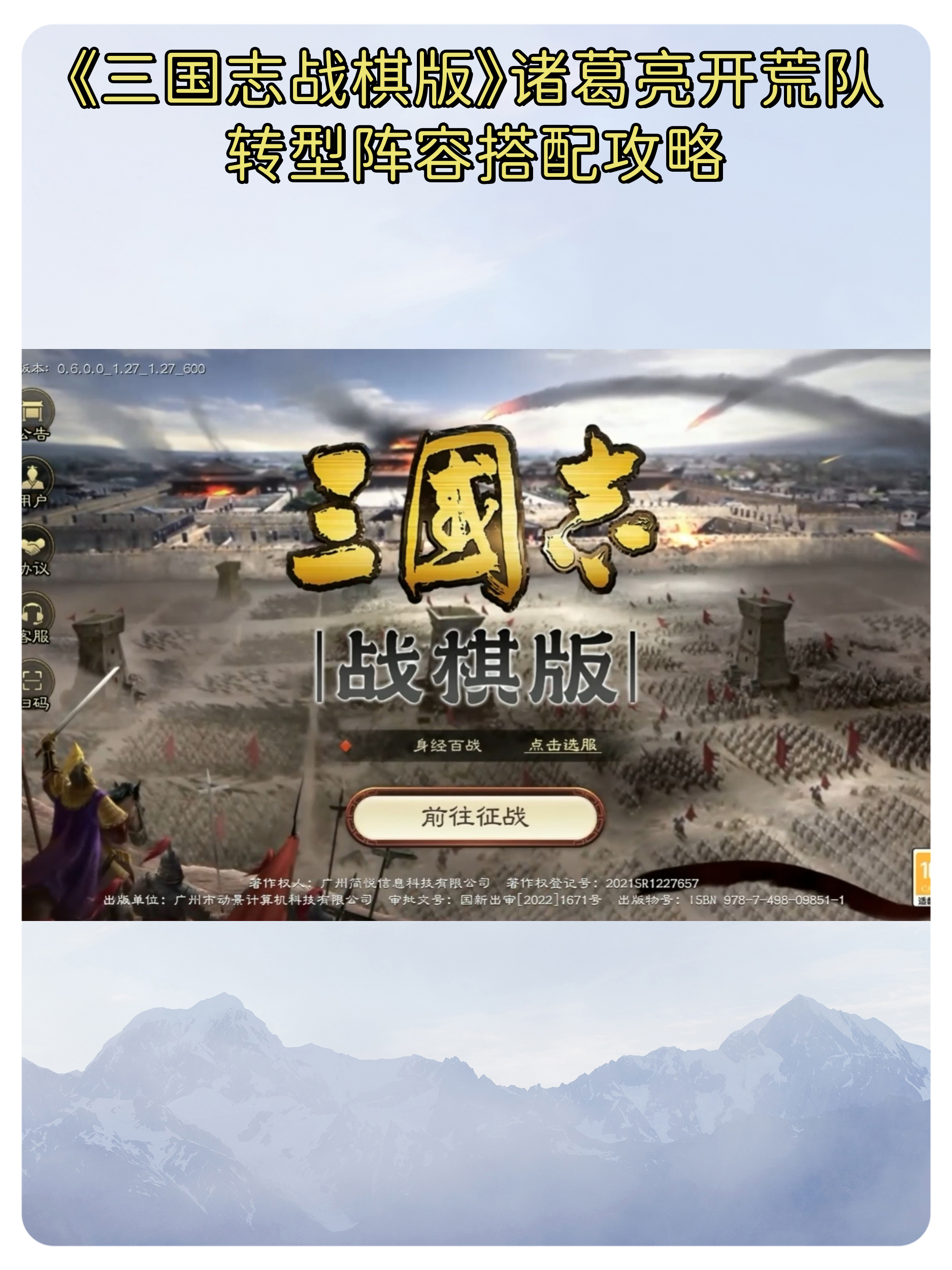 9、在三国志·战略版中,诸葛亮赵云和法正的战法搭配是策略战斗的关键诸葛亮以夺魄和杯蛇为主要战法,全智加点,兵书选择避其锐气与铁甲,旨在防御的同时增强输出赵云则装备破阵与横扫,全武加点,配合兵书攻其不备与鬼谋,能够稳定发挥群攻伤害,与盛气凌敌联动,前两回合即可造成震慑效果,有效。