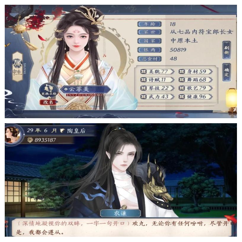 3、选角色刚开始进入页面,选第一个 高自由后妃养成路线,这个是免费的不送花都可以玩角色属性页面a年龄不重要 都可以进宫b国家有中原地区初始位分最高为美人和xxx重之女臣之女或者是公主初始位分最高为贵人 c银两和总食材很重要,银两建议在5万以上不然很可能会破产出局,总食材关系到吃饭。