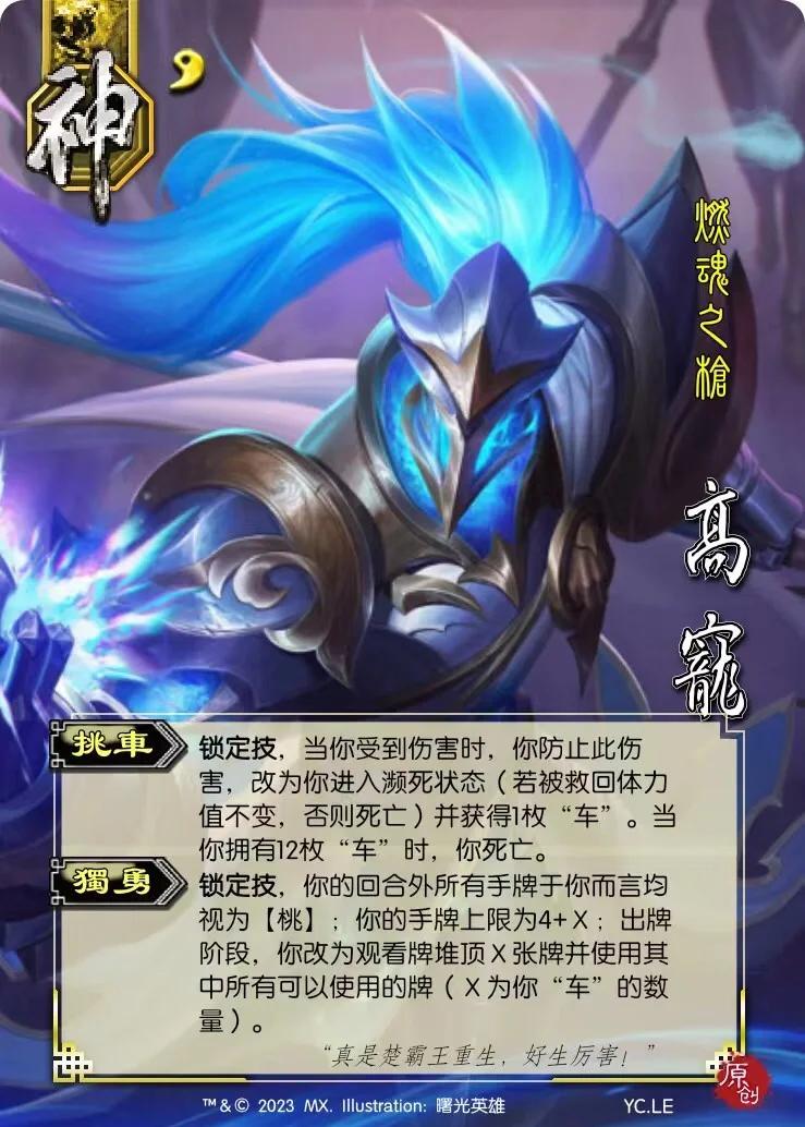三国杀中神将的设定逐渐拓宽,不再拘泥于特定扩展包,这反映出游戏开发商可能为了盈利而放宽了神将的设计标准如今,只要三国时期著名的战役或名将似乎都有资格晋升为神将以下是我尝试设计的几位神将,旨在增强其游戏内的独特性和战略价值神马超渭水之战势力 神,4勾玉,称号 渭水军神 骁袭。