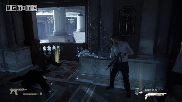 3.偷钥匙卡的部分,玩家需要按下L2键把视线聚焦到指定位置,只要位置正确计量槽便能增长。满了之后再次按下△键就能把钥匙卡偷走。作为目标的服务员在玩家初始位置的右前方柱子旁。如果失败的话也无需担心,山姆会登场并帮玩家一把。