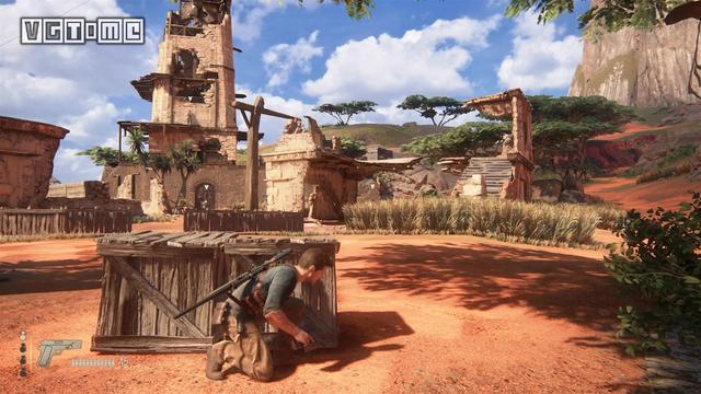 3.玩家接下来会来到一个古建筑,玩家需要利用雷管炸开两扇木门,一扇木门通往前进的道路,另一木门后有玩家用来垫脚用的平台。