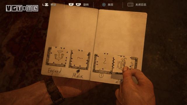 3.接下来的大型解谜玩家需要根据每个图案四条边的上的星星图案连接起来,难度不高,简单而言便是先把中间的确定下来,之后的连接便会简单许多。玩家还需要通过L2键和△键来在每个船长的画像中找出其对应的四边形。玩家可以在笔记本上完成谜题,然后直接按着笔记本旋转图案即可解开谜题。