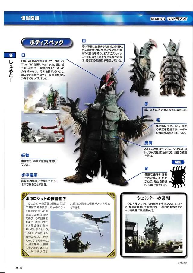 原本生活在海底深处的怪兽,因为被ZAT的水中火箭塞入口腔牙缝中而来到陆地上,又被东光太郎乘坐天鲸号并用天鲸号上的机械手取出怪兽嘴里的火箭,但由于东光太郎的误操作将天鲸号上的机械手误拔了牙齿、十分痛苦而暴怒,从口中吐出火焰进行大肆破坏。习性似鳖,躯体坚不可摧,竟能抵御泰罗奥特曼的斯特利姆光线。终被ZAT以装载炸药的水中火箭歼灭,此乃歇尔塔之终结。