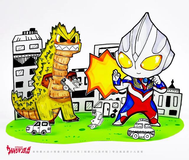 奥特曼和怪兽是在城市街道上激战,还是在山川大地上对决呢?鼓励学生选择自己感兴趣的场景进行创作。引导他们将绘制好的奥特曼与怪兽剪下,同时剪出部分背景元素。使用卡纸或硬纸条折出“口”字形或“L”形支架,粘在角色背面,将奥特曼和怪兽立在前景或中景,突出激烈的战斗场面;背景元素如高楼或树木放在后方,制造空间层次感。通过立体场景布置,让作品更具空间感和故事性,使奥特曼与怪兽的战斗场景更加生动有趣。